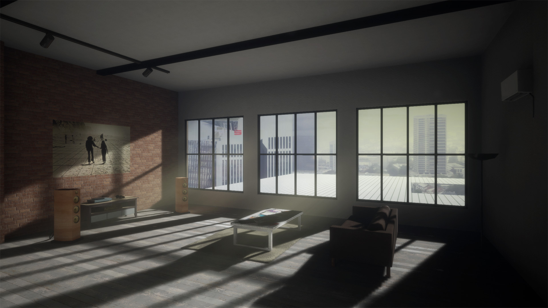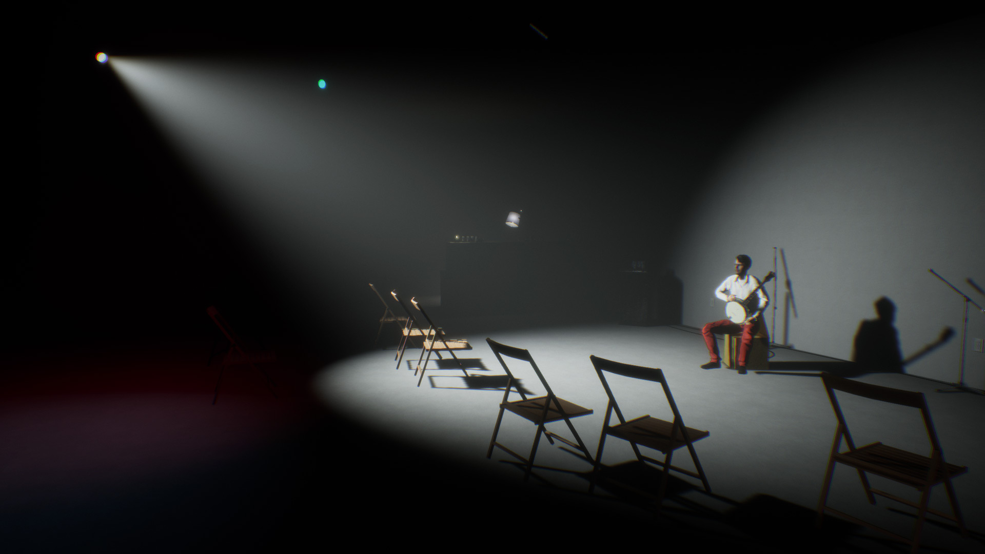 "Four Movements" is a music album constructed in video game space. The project consists of several navigable environments (an empty club, a loft residence, an 'open world' intersected with a modernist grid, etc.) where the virtual participant can perform listening.